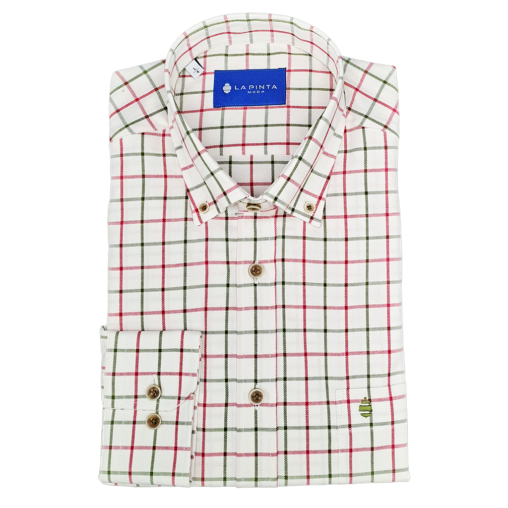 Villela de algodón de fondo blanco con dibujo en forma de cuadros grandes de color verde oliva  y granate. Sin contraste  en interior de cuello y puños.