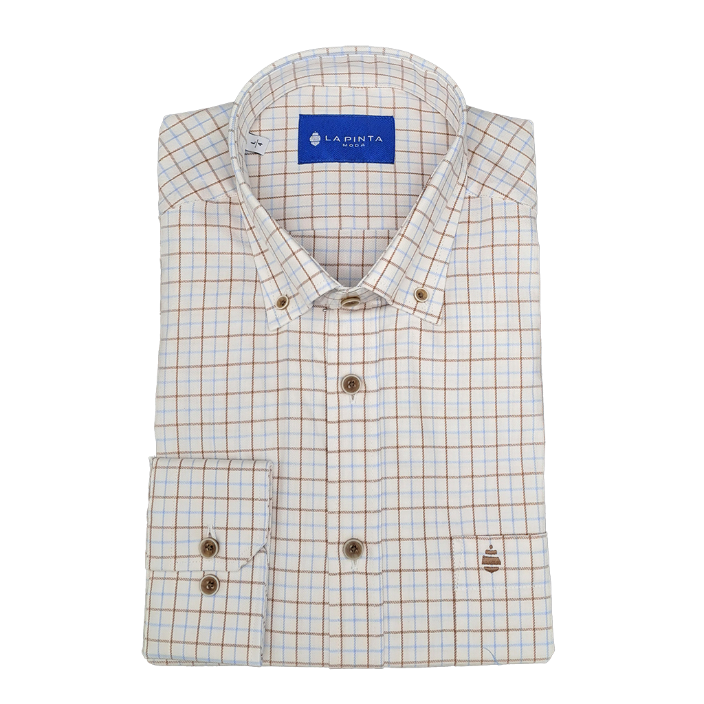 Villela de algodón de fondo blanco con dibujo en forma de cuadros de color azul celeste y marrón claro. Sin contraste en interior de cuello y puños.