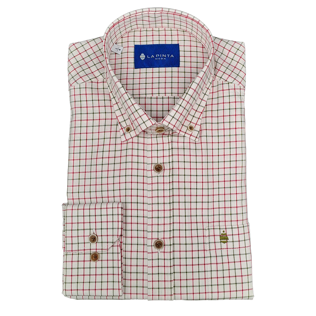 Villela de algodón de fondo blanco con dibujo en forma de cuadros de color verde oliva y granate. Sin contraste en interior de cuello y puños.