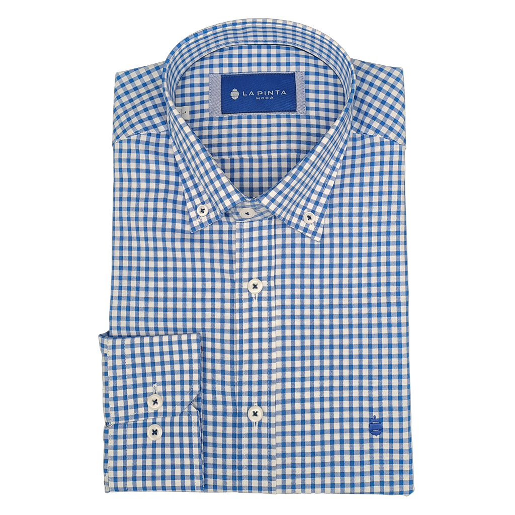 Tela de tipo Oxford (pinpoint oxford) fondo blanco y cuadros de tamaño grande de color Azul.